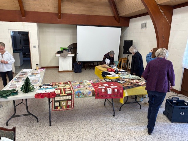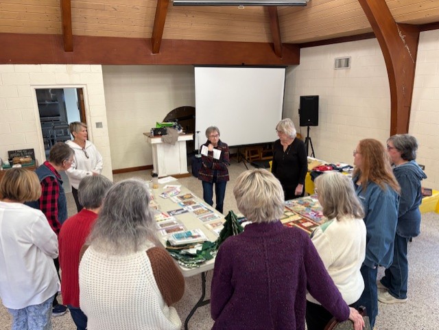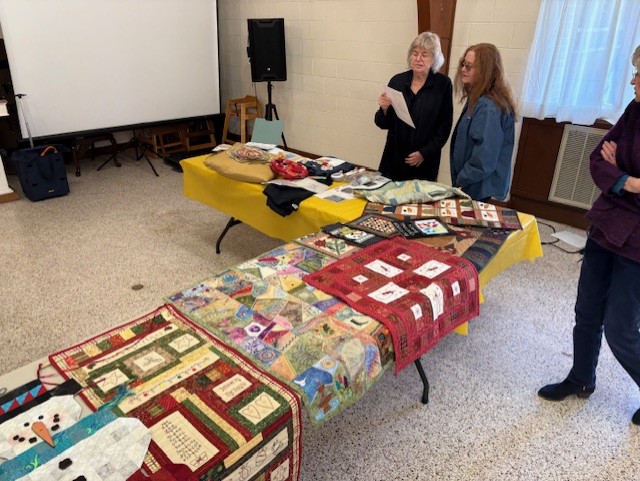 Members shared beautiful examples of embroidery, a quilted coat, wreath and Christmas tree projects, coffee mats, pillows, and a sweatshirt conversion. With several new members attending, we also took time to share our quilting stories and get to know one another better. The meeting ended on a cheerful note as we sang “Happy Birthday” to Duane!